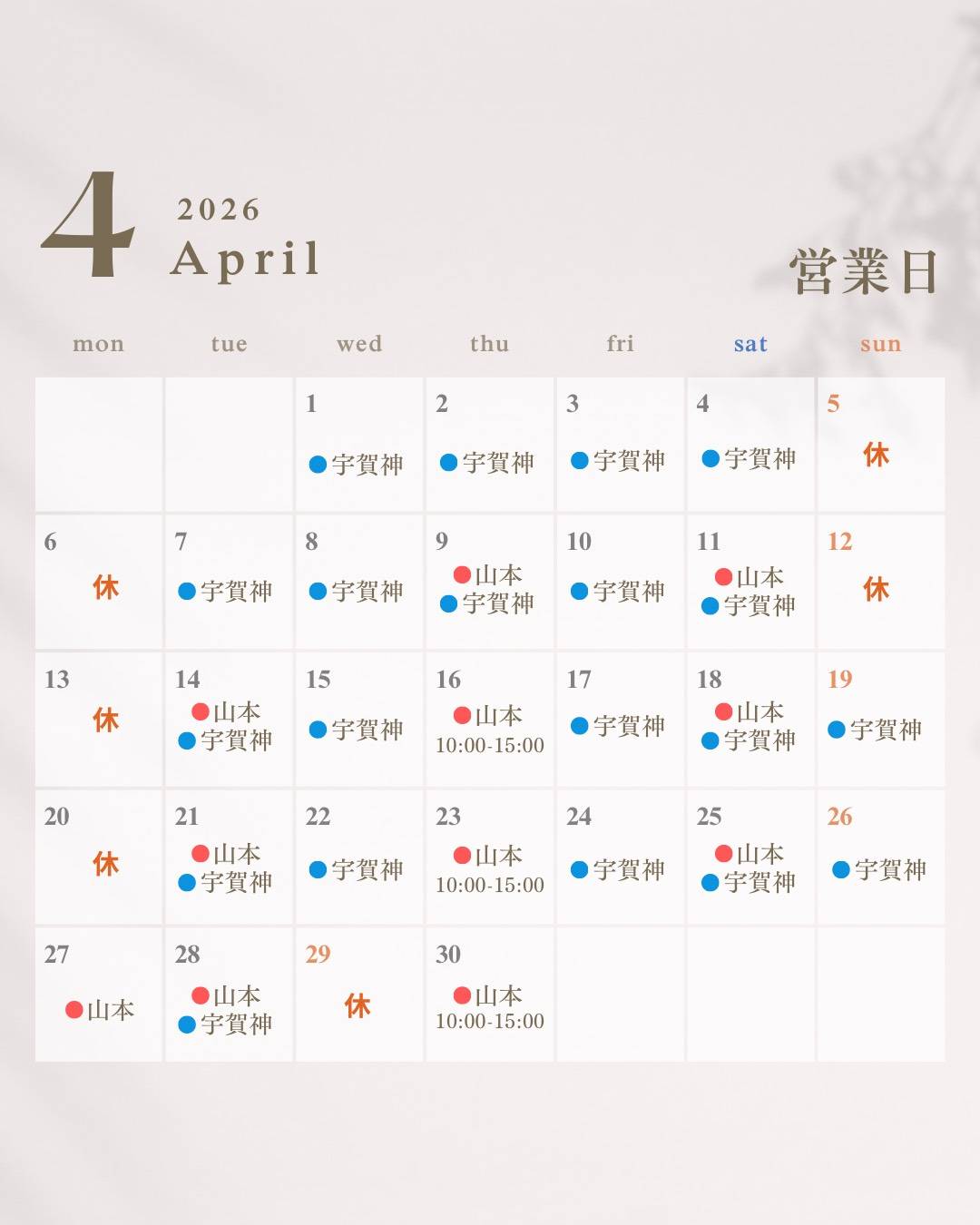 また月曜日も月に2回、ご予約をお取りする事ができます。