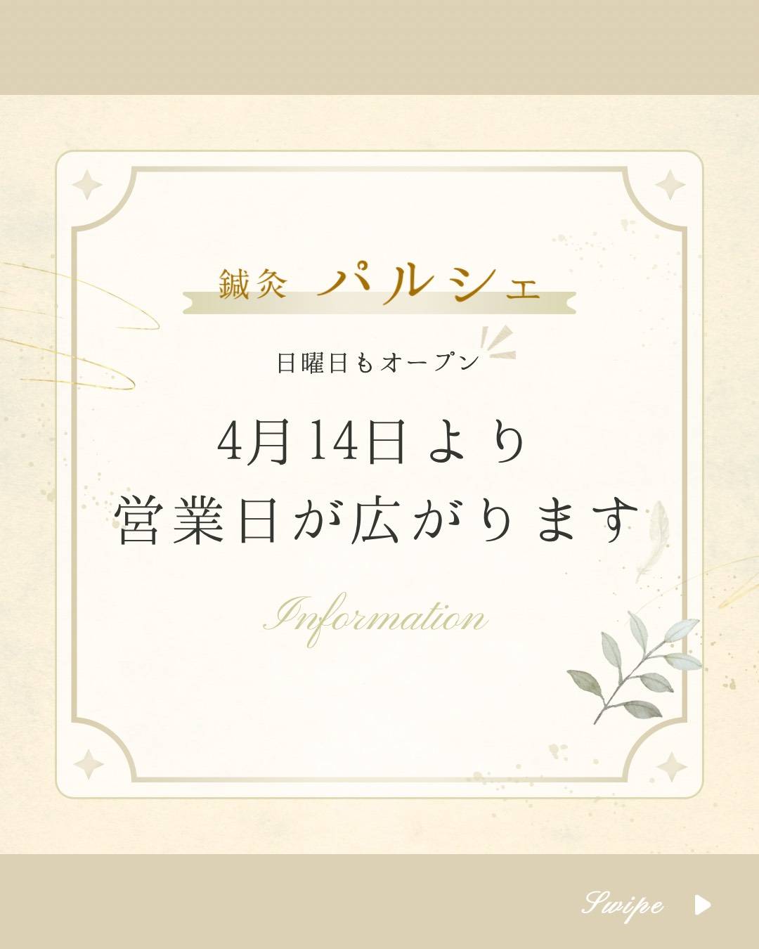 4/14(火)から、鍼灸パルシェは、日曜日も営業致します!